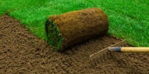 Laying down the sod is simple and quick, but the trick to having sod roots take and continue to succeed in a new patch of ground is a properly prepared dirt surface. If you are repairing a patchy area of lawn, you will want to clear the area of the existing grass and weeds. Use a combination of shovels and grass rakes—rakes with rigidly-hard metal teeth—to overturn the topmost layer of soil. When you have cleared the area, establish a rough grade to the ground. Use stakes and twine to establish a rough grade—low spots should be filled and high spots leveled. And when you have an established grade—it doesn’t need to be absolutely perfect (you’re going to till the soil soon), just get it level enough that the ground is flat, without hills or divots. When the yard is set to a rough grade, it’s time to till in compost. Why compost? Compost adds nutrients to the soil; it holds in twice as much water at the base of the grass’s roots than dirt; and, whether the underlying soil is overly compacted or too sandy, the compost will change the soil’s characteristics. Spread 3 to 6 inches of compost per 1000 square feet and then till in the compost with the soil to a depth of 4 to 6 inches. With the soil tilled, firm up the ground by packing it down or watering it down; if the forecast is calling for rain or snow, the incoming precipitation will naturally level the ground. Fine grade the freshly tilled/packed ground and you are ready to lay new sod.